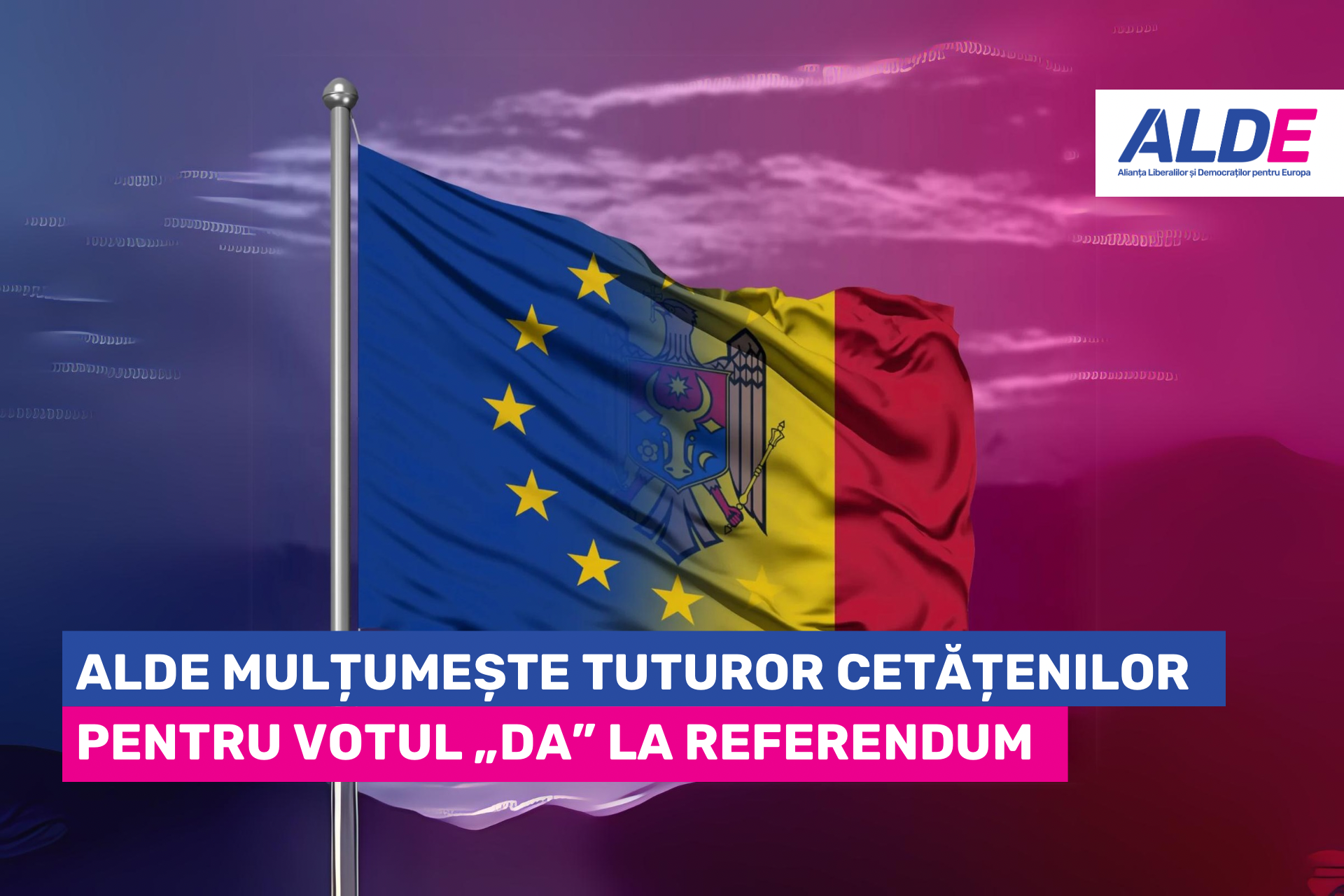 Chișinău, 22 octombrie 2024 – Alianța Liberalilor și Democraților pentru Europa (ALDE) mulțumește tuturor cetățenilor care au votat DA la Referendumul din 20 octombrie.